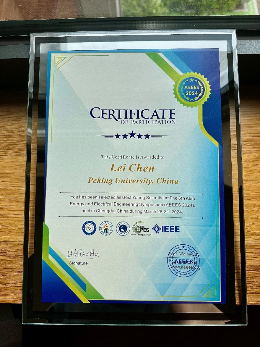 我院助理研究员陈垒博士获IEEE AEEES组委会颁发优秀青年科学家奖2024年3月,第六届IEEE AEEES国际能源与电力工程会议在四川成都召开。会上,我院助理研究员陈垒博士因在分布式能源及新型电力系统宽频监测与分析方面的贡献(包括发表在期刊《Applied Energy》(IF:11.2)和《Renewable and Sustainable Energy Reviews》(IF:15.9)上的研究成果)获颁优秀青年科学家奖(Best Young Scienti sts)奖项。该奖项每届评选一次,一次评选三名,以表彰在能源与电力工程(Energy and Electrical Engineering)领域做出杰出贡献的青年科学家。2024-04-03 -